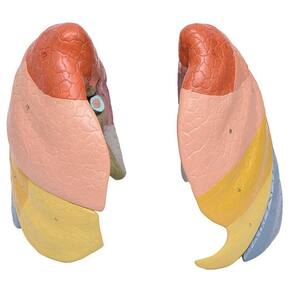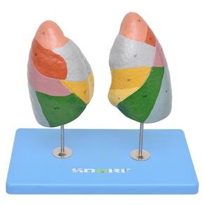 Modelo anatômico de Pulmões segmentado em cores confeccionado em PVC, apresentado em tamanho natural e confeccionado em PVC; O modelo SD-5055/C mostra ambos os pulmões em 10 segmentos sendo:
