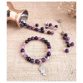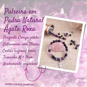 Pulseira Ágata Roxa com pingente Coruja Pulseira em Pedras Naturais Ágata Roxa 8mm com Pingente Coruja