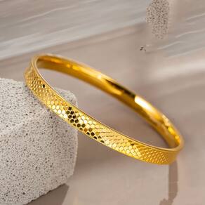 Tamanho: 58# Material: Gold Placer Feita a partir de ouro premium — Feita com revestimento de areia dourada de alta pureza, esta pulseira oferece um tom dourado vívido com excelente durabilidade e uma superfície interna polida. Padrão CNC Dragon Scale — Apresenta um motivo de escama de dragão com textura de pontos sem costura produzido por meio de corte CNC de precisão, proporcionando uma superfície cintilante com definição nítida. Acabamento polido altamente refletivo — A superfície que capta a luz cria um efeito espelhado deslumbrante de todos os ângulos, tornando-a uma declaração de estilo sob luz natural e artificial. Design clássico de pulseira redonda — o tamanho 58 # com uma estrutura elegante e fechada garante conforto e versatilidade, ideal para usar sozinho ou combinar com outros estilos minimalistas. Apelo moderno e sofisticado — Um estilo popular entre mulheres modernas, esta pulseira une a influência do padrão tradicional com um acabamento moderno de alto brilho.