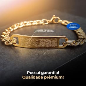 O pingente, com 4,5 cm de comprimento e 1 cm de largura, adiciona um elemento distinto à pulseira. Com a oração do Pai Nosso gravada de forma sutil, este acessório não é apenas uma pulseira, mas sim uma expressão significativa de fé e estilo.