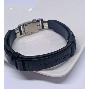 Pulseira Masculina Couro Preto Placa Preta Foco Força E Fé