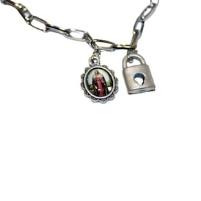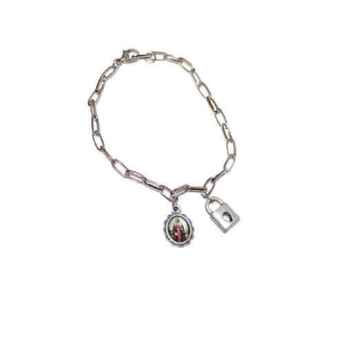 Pulseira Cadeia de Consagração com Medalha de Nossa Senhora das Lágrimas e pingente em formato de cadeado. Medalha em Metal.