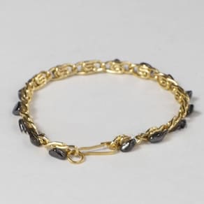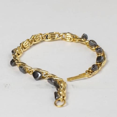 Pulseira Corrente com pedrinha de Hematita rolada colada em cima ótimo brilho, pedra genuina de garimpo mineral autêntico. Pulseira com arco em forma de elo de corrente com pedra colada no topo metal dourado.