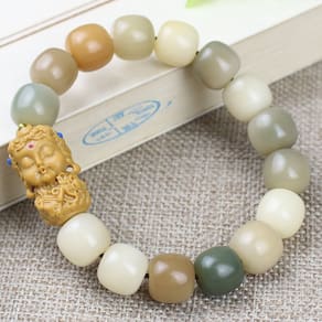 Tamanho: Diâmetro do cordão 11 x 12 mm, 15 peças Material: Design de inspiração étnica bodhizi — Apresenta uma peça central de miçangas de Tara feita à mão e miçangas lisas de bodhizi (raiz de Bodhi) em cores suaves em tons doces, refletindo a estética espiritual e cultural. Miçangas Bodhi naturais — Feitas de material Bodhizi, cada miçanga de 11 x 12 mm é polida até obter um brilho sutil, oferecendo um toque natural e uma textura orgânica que é confortável no pulso. Ajuste unissex e ajustável — Projetado para homens e mulheres, o cordão elástico permite um ajuste confortável na maioria dos tamanhos de pulso, tornando-o adequado para uso diário ou prática espiritual. Peça espiritual simbólica — O amuleto detalhado de Tara personifica compaixão e proteção, ideal para quem busca paz, atenção plena ou uma conexão com as tradições budistas. Acessório boho versátil — perfeito para uso casual, meditação, ioga ou como parte de um look boêmio ou de inspiração tribal. Complementa roupas de fibra natural e acessórios de madeira.