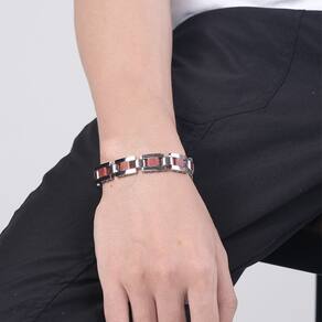 Tamanho: 21 x 1,3 cm Peso: 47 g Material: aço inoxidável Design embutido em madeira — A pulseira exclusiva apresenta elos de aço inoxidável polido com tiras de madeira natural embutidas, criando um contraste quente e marcante em textura e tom. Estrutura de aço inoxidável premium — Feita de aço resistente à corrosão para durabilidade e brilho a longo prazo, adequada para uso casual e semiformal. Fecho dobrável seguro — equipado com um mecanismo de fecho robusto que garante uma fixação firme e fácil de calçar/tirar sem comprometer o estilo. Ajuste confortável e peso equilibrado — mede 21 cm de comprimento e 1,3 cm de largura, com um peso balanceado de 47 g que oferece substância e conforto. Fusão de estilo rústico e urbano — Ideal para quem aprecia detalhes inspirados na natureza combinados com design contemporâneo — perfeita para roupas de rua, looks de fusão étnica ou estilos do dia a dia.