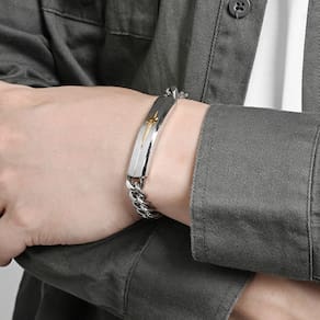 Tamanho: 21 cm Peso: 43 g Material: aço inoxidável Design de incrustação em estrela em tom dourado — Apresenta uma barra elegante em estilo ID gravada com um motivo de estrela dourada de seis pontos e detalhes em cristal preto embutido, simbolizando ousadia e orientação. Construção em cadeia cubana — Os elos clássicos cubanos oferecem uma estrutura atemporal e um acabamento polido que complementa a moda moderna e retrô. Material de aço titânio — Feito de aço inoxidável de alta qualidade com uma superfície lisa e resistente ao desgaste e peso confortável para uso diário. Fecho dobrável seguro — Projetado com um fecho oculto resistente para estética simplificada e fixação confiável durante todo o dia. Acessório Statement Urban — Com seu apelo leve e luxuoso e 21 cm de comprimento, esta pulseira adiciona um toque distinto a roupas de rua casuais, estilos minimalistas ou looks de pulso em camadas.