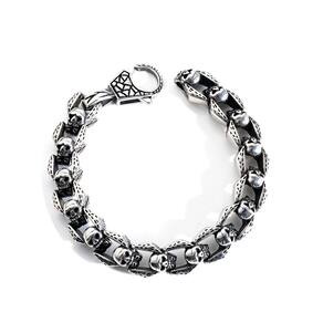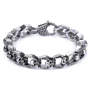 Tamanho: 22 x 1,2 cm Peso: 63 g Material: aço inoxidável Design de caveira gótica texturizada — a pulseira ousada apresenta elos de caveira intrincadamente esculpidos com gravura vintage, oferecendo uma poderosa declaração visual de punk-rock. Aço inoxidável de alta qualidade — Feita de aço inoxidável durável, esta pulseira resiste a manchas e oxidação, mantendo um brilho premium ao longo do tempo. Fecho artístico seguro — O fecho de lagosta com estampa exclusiva adiciona funcionalidade e elegância, garantindo um fechamento seguro com uma estética atraente. Presença ousada no pulso — Com 22 cm de comprimento e 1,2 cm de largura e um peso sólido de 63 g, esta peça oferece uma sensação substancial e o máximo impacto visual para homens confiantes. Ideal para streetwear e moda alternativa — Perfeita para fãs de estilo gótico, motociclista ou alternativo — esta pulseira combina bem com jeans, couro ou moda urbana casual.