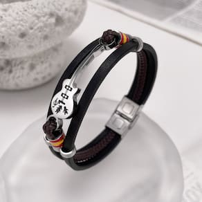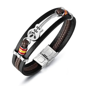 Tamanho: 22x1,3 cm Peso: 18 g Material: aço inoxidável/Design inspirado na guitarra PU — Apresenta um pingente de guitarra de aço inoxidável gravado com notas musicais e silhuetas, perfeito para amantes da música e entusiastas da moda punk. Estilo de couro em camadas — combina couro PU preto liso com fios trançados marrons para um acessório de pulso visualmente dinâmico e confortável. Fecho dobrável seguro — Equipado com um fecho durável de aço inoxidável para um fechamento confiável, permitindo fácil uso sem comprometer a segurança. Detalhes de realce colorido — Os detalhes dos anéis em vermelho, amarelo e preto adicionam um toque vibrante e jovem ao design geral ousado, fazendo com que ele se destaque. Apelo de rua — Projetado para homens que amam rock, cultura de rua ou joias personalizadas — ótimo para shows, festas ou uso diário.