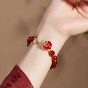 Tamanho: Diâmetro do cordão 8 mm Peso: 17 g Material: ágata Inspirado no simbolismo chinês — Apresenta um vibrante pingente de círculo de paz de ágata vermelha combinado com um motivo de peixe koi, representando harmonia, prosperidade e boa sorte na cultura chinesa. Acento de jade premium — Inclui um cordão de jade Hetian suave que adiciona um contraste natural ao tom vermelho profundo, elevando a elegância geral da pulseira. Design retrô leve e luxuoso — combina elementos clássicos chineses com estética moderna refinada, perfeita para ocasiões formais ou roupas do dia a dia. Feita para oferecer conforto — miçangas redondas de 8 mm e um peso total de 17 g tornam esta pulseira leve e ideal para uso durante todo o dia sem comprometer a sofisticação. Detalhes cuidadosamente feitos à mão — Espaçadores dourados e elementos pendentes simbólicos completam esta peça artística, enfatizando a individualidade e a identidade cultural.