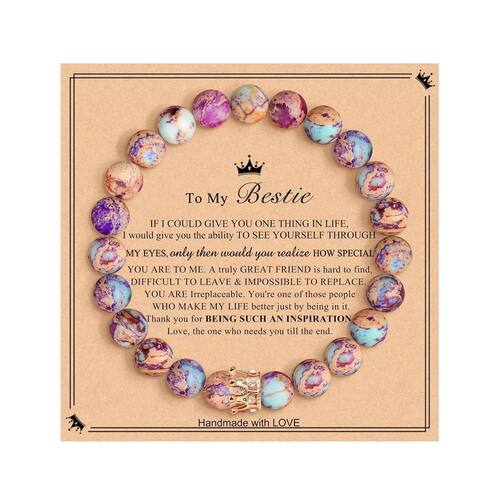 Tamanho: Diâmetro do cordão 18 mm Material: mármore dourado Grandes contas de pedra natural de 18 mm — Apresentam contas redondas polidas de 18 mm feitas de pedra rosa do imperador zebra, conhecida por seus impressionantes padrões de mármore em tons de roxo, rosa e bege. Detalhes em mármore dourado — Os tons quentes de terra combinados com elementos dourados criam um acessório elegante e básico, adequado para looks casuais ou marcantes. Cartão de mensagem inspirador incluído — vem com um sincero cartão “Para minha melhor amiga”, lindamente projetado para expressar gratidão e amor entre companheiros próximos. Design elástico para fácil ajuste — Feita à mão com um cordão elástico, esta pulseira se encaixa confortavelmente na maioria dos tamanhos de pulso, oferecendo durabilidade e conveniência de uso diário. Ideal para ocasiões significativas — Perfeito para momentos marcantes de amizade, expressão emocional ou simplesmente para adicionar um toque espiritual e artístico à sua coleção de joias.