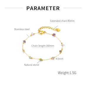 Tamanho: 160+40 mm Peso: 1,5 g Material: aço inoxidável Detalhes coloridos em pedra natural — Apresenta uma mistura encantadora de pedras naturais multicoloridas em formas irregulares, adicionando um toque vibrante e artístico ao seu estilo cotidiano. Corrente de aço inoxidável premium — Feita com aço inoxidável de alta qualidade e com acabamento dourado para maior durabilidade, brilho e resistência a manchas ou desbotamento. Leve e confortável — Pesando apenas 1,5 g, esta pulseira é ultraleve e fácil de usar durante todo o dia sem desconforto. Design de ajuste ajustável — vem com uma corrente estendida de 160+40 mm e fecho de lagosta, adequado para a maioria dos tamanhos de pulso e conveniente para uso diário ou uso em camadas. Elegância de inspiração étnica boho — Esta pulseira minimalista e ousada apresenta uma construção em corrente e miçangas que combina tanto com os estilos casual, chique e boêmio.
