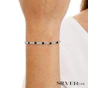 Pulseira feminina com zircônias na cor preta redonda em prata lei 925Acompanha:- pulseira- certificado de garantia e legitimidade- embalagemDescrição:- pulseira feminina com zircônias na cor preta redonda em prata 925- peso 1.4g- tamanho: 19 cm- origem: brasil- composição: prata 925 Garantia do fabricante Garantia contra defeitos de fabricação, reposição de pedras em caso de queda espontânea e certificação da prata 925.A garantia não cobre quebras, amassados, ralados e uso excessivo.A garantia se anula em caso de mau uso, entende-se como mau uso exposição a produtos químicos, altas temperaturas e qualquer situação fora do uso normal.Produto de metal, composto por 92,5% de prata e 7,5% de ligas nobres.Garantia legal de 1 ano