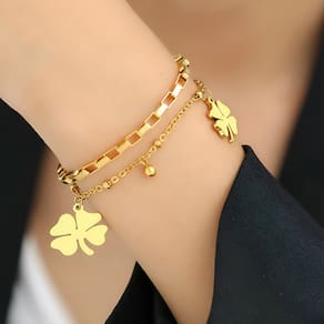 Linda pulseira de trevo dupla que possui um toque de elegância e personalidade, com ela você pode criar diversas combinações e tornar cada produção única e cheia de glamour. Desperte a sua sorte e eleve seu estilo com a Melian.