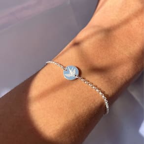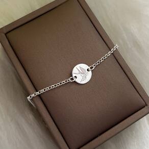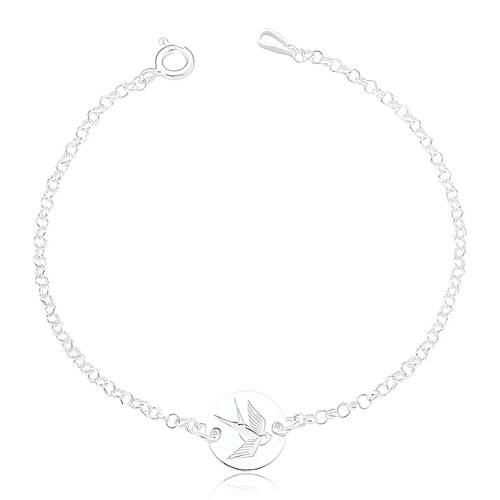 A pulseira apresenta um elegante pingente circular, meticulosamente trabalhado em prata 925, com o delicado desenho de uma andorinha em pleno voo. A ave é capturada com as asas abertas, simbolizando liberdade e esperança.