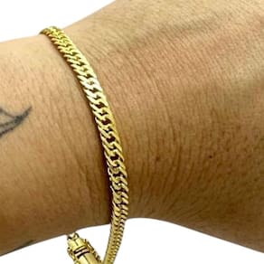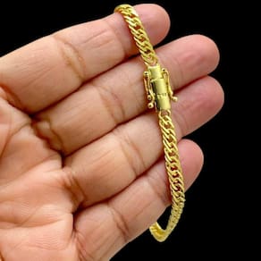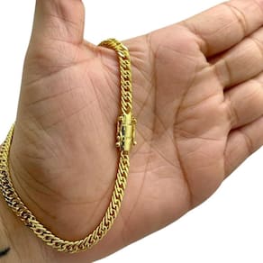 Pulseira Grumet 5mm Fecho 750 Especial Banhado a Ouro 18K Detalhes do Produto: Material: ligas metálicas de alta qualidade, especialmente tratadas para fixação e absorção do ouro, com acabamento em verniz protetor. Aparência: visual idêntico ao ouro maciço. Produção: artesanal, com atenção meticulosa aos detalhes. Banho: 10 camadas espessas de ouro 18k, finalizadas com verniz antialérgico . Elos: soldados varia conforme o modelo . Pedras: zircônias brilhantes cravejadas quando aplicável . Tamanhos Disponíveis: Cordões Masculinos: 70cm padrão e 60cm sob consulta/Pedido Via Chat . Cordões Femininos: 50cm padrão e 45cm sob consulta/Pedido Via Chat . Pulseiras: 21cm padrão ; tamanhos de 18cm a 23cm sob consulta/Pedido Via Chat. Pingentes: conforme imagens; consulte para mais detalhes via chat. Espessuras Recomendadas para Cordões / Pingentes: P: 1mm a 4mm M: 4mm a 8mm G: 6mm a 13mm Gg: 12mm a 18mm Incluso na Compra: Saquinho de organza para armazenamento seguro. Caixa elegante, perfeita para presente. Cupom de desconto para a próxima compra. Flyer com outros produtos da coleção. Carta de agradecimento personalizada. Adesivo da marca ToJoia18k. Informações Adicionais: : 6 meses termos acompanham o produto . Devolução: 7 dias para devolução sem questionamentos. Envio: despacho em até 24 horas úteis após confirmação do pagamento. Cuidados com a Peça: Evite contato com produtos químicos; aguarde o perfume secar antes de usar. Evite contato com shampoo, condicionadores e suor excessivo. Armazene em local seco, preferencialmente no saquinho de organza fornecido. Uso no mar e piscina é permitido; lave com água corrente e sabão neutro após. Por que Escolher a ToJoia18k Semi-joias luxuosas que combinam estilo, qualidade e sofisticação. Banho espesso de ouro 18k, garantindo brilho duradouro e acabamento impecável. Design exclusivo e produção artesanal, perfeitos para qualquer ocasião. Materiais premium que asseguram durabilidade. Ao escolher uma semi-joia ToJoia18k, você investe em qualidade, elegância e uma experiência única. Aguardamos sua compra Observação: pode ocorrer variação no fecho raramente . Imagens reais, sem edição. Qualquer dúvida, estamos à disposição para esclarecimentos. Marca: Não Informado