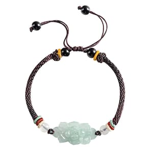 Tamanho: Lotus 32x8x13mm, diâmetro do cordão 5,5 mm Peso: 6g Material: jade A peça central de lótus de jadeíte birmanesa natural apresenta uma flor de lótus esculpida à mão (32 × 8 × 13 mm) feita de jade birmanês de grau A, simbolizando iluminação, pureza e paz. Design durável de corda trançada A pulseira usa um cordão marrom escuro para maior resistência e conforto, complementado por fios coloridos e miçangas em tom de ônix. Ajuste unissex ajustável. O fecho deslizante permite um ajuste flexível e seguro, adequado tanto para homens quanto para mulheres, perfeito para casais ou para uso pessoal diário. Acentos Balanced Energy Bead ladeados por contas redondas decorativas de 5,5 mm em materiais contrastantes, aprimorando o foco espiritual e enriquecendo o design geral. Estilo tradicional com apelo moderno Esta pulseira une o simbolismo chinês clássico a uma estética minimalista, ideal para usuários espirituais e amantes de joias artesanais culturais.