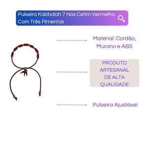 A Pulseira Sete Nós Vermelha Kabbalah da Bialluz, possui em cada nó a representação de diferentes dimensões espirituais que compõem nossa realidade. Carregá-la em sua mão esquerda oferece imunização espiritual contra o mau olhado, que é um dano transmitido pela pessoa consciente ou inconscientemente. E finalmente, o vermelho está relacionado a um aviso de perigo. É uma pulseira protetora contra todo perigo,enquanto as pimentas simbolizam proteção e boa sorte.
