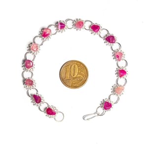 Pedra: Ágata Rosa Rolada (Pedra Natural e Autêntica) Design: Arco delicado em forma de margarida com pedra colada no topo, destacada por metal prateado de alta qualidade. Brilho: Alto brilho, proporcionando um visual elegante e encantador. Tamanho da Pulseira: 19,3 cm (tamanho ajustável para se adaptar confortavelmente ao seu pulso) Tamanho da Pedra: 4 x 6 mm (aproximadamente) Cor da Pedra: Rosa (foto ilustrativa) Material: Metal prateado e pedras genuínas, garantindo resistência e durabilidade.