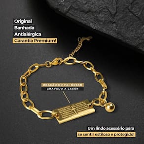 - Pingente com a Oração do Pai Nosso: A pulseira possui um pingente retangular banhado a ouro, gravado a laser com a Oração do Pai Nosso completa. A gravação é feita com precisão, destacando cada palavra dessa oração tão especial, sendo um símbolo de proteção e devoção para carregar consigo em qualquer momento. Não perca a oportunidade de ter consigo uma peça única e cheia de significado.