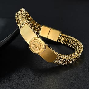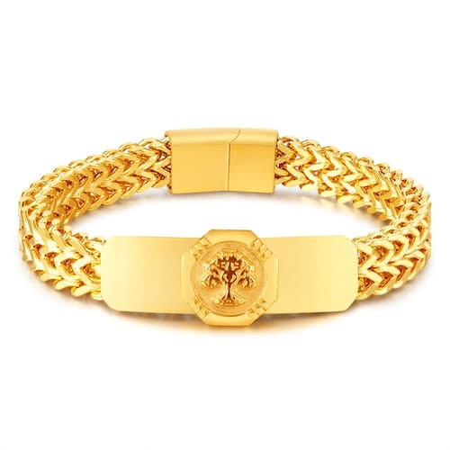 Tamanho: 21 x 1 cm Peso: 52 g Material: aço inoxidável Peça central do emblema Tree of Life — apresenta um símbolo proeminente da Árvore da Vida em relevo, representando força, crescimento e conexão, ideal para uma expressão pessoal significativa. Design de placa gravável personalizado — A barra de superfície escovada oferece espaço para gravação opcional, adicionando um elemento personalizado à estética ousada. Acabamento em tom dourado polido — Galvanizada em um tom dourado premium, a pulseira exala uma vibração retrô sofisticada, adequada para moda diária ou uso elegante. Elos de corrente em tecido texturizado — A corrente apresenta um padrão bem trançado para uma forte textura visual e apelo masculino. Construção durável em aço inoxidável — Construída com 52 g de aço inoxidável sólido, oferecendo resistência excepcional ao desgaste, desbotamento e corrosão.