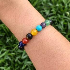 Esta linda pulseira tem o significado de 7 chakras - A palavra chakra vem do sânscrito e significa roda, disco, centro. As Pedras dos Chakras alinham e ativam nossos centros de energia e assim melhoram toda nossa saúde energética, física e mental. A ativação dos Chakras, além de fortalecer a saúde e equilibrar as emoções, permite ainda nossa elevação espiritual e também fortalece a intuição e desperta capacidades superiores. Os Chakras são canais dentro do corpo humano nadis por onde circula nossa energia vital o prana que nutre órgãos e sistemas.