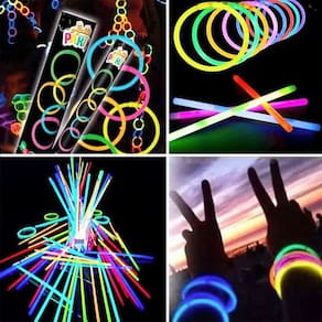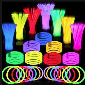 Produto em plástico que contém em seu interior um líquido reativo para dar brilho. Tamanho aproximado de cada pulseira: 20 cm.