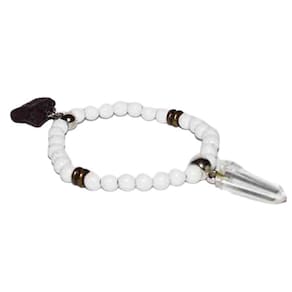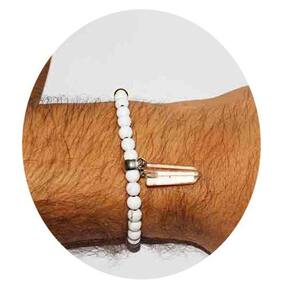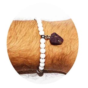 Contém Uma Pulseira Nlux com Purpurita de verdade (100% Natural) com uma delicada pontinha de cristal no lado oposto à purpurita, miçangas Brancas e metal estiloso em contato com a Purpurita.