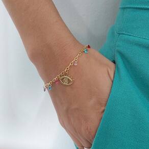 O charme dessa pulseira está justamente nas zircônias coloridas e no olho grego, que simboliza a proteção contra as forças ruins e o mau olhado.
