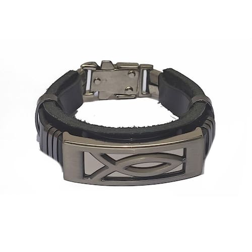 Graça e Paz Somos da MARANATA SHOFAR vendemos Shofar, Talits, Candelabros Menorah, kipá, chaveiros, castiçais, torah, além de diversos itens importados de Israel e produtos nacionais. DESCRIÇÃO DO PRODUTO -01 pulseira em material sintético com partes em metal prata. Contém 22 cm em linha reta. Desfrute de uma pulseira de baixo custo espiritualmente inspiradora . Esta pulseira de couro preto apresenta uma peça central em aço inoxidável de dois tons com um peixe e um desenho de Menorá e Estrela de David. Prendedor confortável. - Pulseira de borracha bonita de baixo custo - Placa de cor dourada no centro - Fecho de metal fácil de fechar Marca: Holy Land