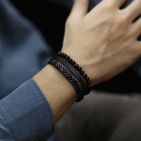 Tamanho: 21 x 12,5 cm Peso: 25,5 g Material: aço inoxidável/miçangas de olho de tigre puras — Apresenta olho de tigre vermelho polido e miçangas de pedra preta que fornecem uma energia terrosa e fundamentada e um contraste elegante. Design de couro PU de várias camadas — combina couro PU trançado marrom e preto com um elegante fio de miçangas, formando uma aparência estruturada e elegante em camadas. Fecho de aço inoxidável preto fosco — o fecho magnético oferece um fechamento forte e fácil de usar, mantendo a pulseira segura durante atividades durante todo o dia. Estética de streetwear vintage — Projetada para homens que apreciam estilos retrô feitos à mão com um toque espiritual ou simbólico. Conforto e ajuste equilibrados — Com 21 cm e 25,5 g, esta pulseira é adequada para a maioria dos tamanhos de pulso, oferecendo conforto durável sem excesso de volume.