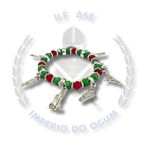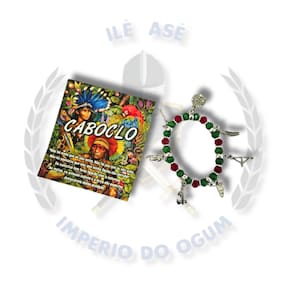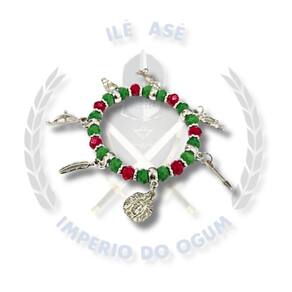Pulseira feita com bolinhas de cristal e pingentes que representam a entidade.