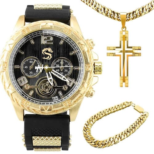Pulseira + Relogio Masculino Dourado Aço Inox Dourado Grande Casual Robusto Banhado Analogico Preto Kit Masculino Premium Orizom Spaceman Dragon - Relógio Dourado, Cordão, Pingente e Pulseira - Relógio Dragon Orizom Spaceman: - Design exclusivo com um dragão gravado a laser no fundo preto. - Pulseira ajustável em silicone para qualquer tamanho de pulso. - Tampa blindada para maior durabilidade. - Arte única, feita com precisão a laser. - Ultra premium e personalizado, ideal para presentear.