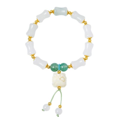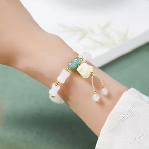 Tamanho: Diâmetro do talão 12x7,6 mm Peso: 17g Material: Tianshans Emerald Green 1. Tianshans Emerald Green Accents Apresenta miçangas verdes ricas em forma de jade de Tianshans combinadas com segmentos lisos em estilo de bambu branco, refletindo vitalidade e beleza natural em harmonia. 2. Peça central de leão intrincadamente esculpida Uma ousada escultura em noz de marfim de um leão chinês tradicional adiciona um toque de simbolismo auspicioso e serve como um encanto focal com significado cultural. 3. Miçangas de 12x7,6 mm inspiradas em bambu A pulseira usa miçangas brilhantes em forma de barril inspiradas em seções de bambu, simbolizando integridade e crescimento na cultura chinesa. 4. Detalhes em prata S925 e construção durável Feita com elementos de prata S925 de qualidade para uso duradouro, esta pulseira oferece elegância artística e durabilidade estrutural. 5. Ideal para outono/inverno Novo estilo chinês Perfeitamente adequado para mulheres que amam acessórios refinados com ressonância cultural, combinando tradição, luxo leve e sofisticação cotidiana.