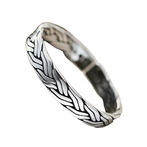 Material: Fabricado em prata premium com acabamento de alto polimento, apresentando brilho e durabilidade duradouros. Apresenta um motivo exclusivo trançado de nove fios que simboliza conexão duradoura, união e afeto atemporal. Projetado com um interior liso e contornado e uma estrutura aberta para ajuste ajustável e uso confortável. Adequado para homens e mulheres, o que o torna um acessório significativo para casais ou para estilos pessoais. Ideal para quem aprecia o design feito à mão com simbolismo sutil e apelo minimalista moderno.