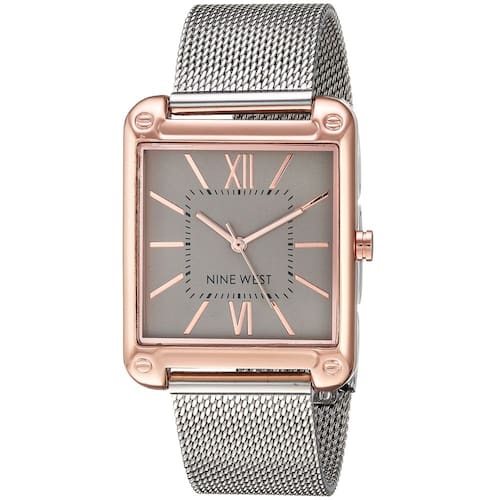 Relógio feminino de malha Sunray Dial Nine West — lente de cristal mineral; mostrador cinza com ponteiros e marcadores em ouro rosa; faixa de minutos interna impressa em preto — Pulseira de malha de aço inoxidável prateada com elos ajustáveis; o relógio vem com um link extensor adicional incluído na pulseira que pode ser removido para ajustar facilmente o ajuste do relógio, sem a necessidade de ferramentas — Movimento de quartzo japonês — Diâmetro da caixa: 29 milímetros — Interior circunferência da faixa: 7 polegadas - resistente a respingos