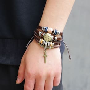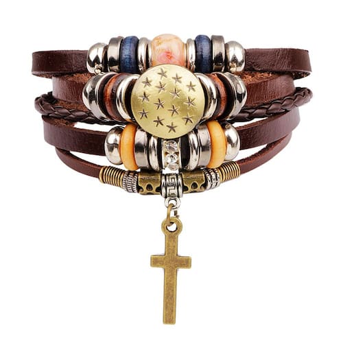 Tamanho: diâmetro 6 cm, comprimento 18-20 cm Peso: 22 g Material: couro bovino Estilo étnico em camadas — Apresenta vários fios de couro bovino trançado e liso com miçangas de madeira e liga leve, criando uma rica estética tribal. Pingente de cruz vintage — realçado por um pingente cruzado pendurado em estilo antigo que adiciona profundidade espiritual e movimento ao design. Boho Star Medallion Accent — Centralizado com uma placa redonda em tons de latão gravada com estrelas, refletindo uma vibração celestial e mística. Qualidade durável feita à mão — Feito cuidadosamente com couro bovino genuíno, elementos de liga leve e cordões de cera para uso duradouro (comprimento ajustável de 18 a 20 cm). Ajuste moderno unissex — ideal para roupas casuais, festivais de música ou roupas de rua; adequado para homens e mulheres que apreciam o estilo espiritual ou boêmio.