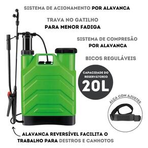 Capacidade para 20 litros Sistema de acionamento por alavanca Trava no gatilho para menor fadiga Sistema de compresão por alavanca Bicos reguláveis Alça com ajustes Alavanca reversível facilita o trabalho para destros e canhotos Material do corpo: polietileno pe Peso aproximado: 4.5kg Não utilize produtos químicos como ácido ou solventes