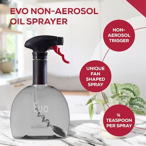 Evo’s autêntico Non-Aerosol Oil Sprayer Bottle, the first of aerosol-free sprayer for cooking oils, sprays without any harmful propellants or chemicals, requires no pumping or priming, and won’t become clogged. In addition to an ergonomically scalloped trigger for a secure grip, the nozzle rotates horizontally or vertically to spray a wide fan-shape to cover more surface with just 1/4-teaspoon for healthy portion and calorie control. The included flavor filter keeps herbs and seasonings from blocking the dip tube, 4 pre-printed silicone bands identify 7 popular cooking oils and balsamic vinegar, and twist-on funnel for spill-free refills. Buy healthy cooking oils in bulk for a more economic benefit. Evenly coat foods, baking and roasting pans, and cooking surfaces with EVOO (extra virgin olive oil), canola, avocado, grapeseed, and other cooking oils, vinegars, infused oils, salad dressings, citrus juices, cooking wines, and more. Without dangerous propellants, Evo is ideal for home cooks and commercial kitchens for stovetop, oven, air fryer, grill, and campsite cooking and safe to spray near gas burners. It’s a reusable, refillable, healthier, more economical choice than aerosol cooking oil sprays. Made with food-safe, Latex, BPA, and DEHP-free materials, Evo’s autêntico Non-Aerosol Oil Sprayer bottle is shatterproof and top-rack dishwasher safe with a hand washable sprayer. Spray hot water through to clear soapy water from the trigger. Bottle, sprayer, and packaging are fully recyclable. Evo’s award-winning design by Michael Graves Design Group (MGDG) integrates superior industrial-sprayer technology into a flawless food-safe cooking oil sprayer. Its attractive profile is worthy of display right on the counter with a slim space-saving design for easy fridge storage. Its form, materials, and color won the prestigious IHA Innovation and Print Regional Design awards. Brought to you by HIC, a third-generation family