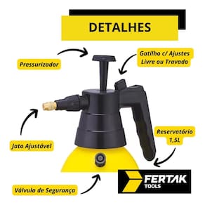 Marca: Fertak Capacidade: 1,5 litros Cor: Amarelo e preto Altura aproximada: 32 cm Diâmetro aproximado: 20 cm Bico: Ajustável Composição: PVC, cobre e borracha Peso aproximado: 340 g (sem líquido)