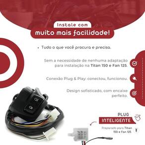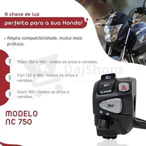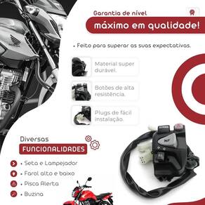 Punho luz titan 150 titan 160 fan 125 150 start modelo cb 650 nc750 O punho chave de seta é um componente essencial para sua motocicleta. Ele é projetado para controlar uma variedade de funções elétricas, como os indicadores de direção, luzes de emergência, buzina e farol alto e baixo. Essa chave de luz nc 750/700 possui um design mais moderno e ergonômico, além de contar com funções adicionais, como pisca alerta e lampejador. ----------------------------------------------------------------------------------------------------------- Compatível com: Honda fan 125 Honda fan 150 Honda titan 150 Para esses modelo acima, não tem necessidade de adaptação ----------------------------------------------------------------------------------------------------------- Compatível com: Honda nc 750/700 Honda titan 160 fan 2016 a 2022. Honda titan 160 start 2016 a 2022. Honda fan 160 2016 em diante. Nesses modelos acima, há necessidade de trocar o fio preto com o marrom ----------------------------------------------------------------------------------------------------------- A instalação do punho chave de luz nc 750/700 adaptável titan 160 fan start é recomendada por um qualificado. ----------------------------------------------------------------------------------------------------------- O punho possui as seguintes funções: Pisca alerta: aciona as setas da moto de forma simultânea. Lampejador: aciona as setas da moto de forma intermitente, para indicar uma mudança de direção. Farol alto e baixo: aciona o farol da moto, podendo ser ajustado para alta ou baixa luminosidade. Setas: aciona as setas da moto de forma individual. Buzina: aciona a buzina da moto. ----------------------------------------------------------------------------------------------------------- Quem é a dajshops, como nascemos A dajshops é o lugar perfeito para encontrá-lo Além disso, nossas avaliações de clientes são 4,9/5 em todas as análises, tornando-nos a melhor escolha para suas necessidades de compras. Junte-se a milhares de clientes satisfeitos hoje e experimente comprar na dajshops você mesmo Sejam bem vindos Marca: Não Informado
