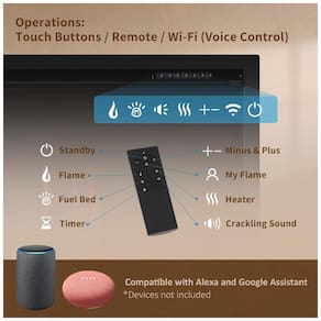 Este modelo de lareira elétrica foi projetado para ser instalado em 6 paredes. Seu design é linear, elegante e contemporâneo, com acabamento para uma aparência limpa. A lareira pode ser instalada diretamente na parede ou embutida em uma parede emoldurada ou independente. É fácil de operar através de um aplicativo de dispositivo inteligente, controle de voz Alexa, Google ou controle remoto. Há 9 cores de chama e leito de combustível, som de estalo com brilho ou volume ajustáveis. Madeira flutuante e cristais estão incluídos, permitindo que você mude a aparência da sua lareira para se adequar ao seu estilo e necessidades. A lareira possui aquecimento baixo e alto, com temperatura definida. Ela pode ser usada com ou sem as chamas. É seguro montar uma TV acima dela. Há duas opções de fiação disponíveis conectar em uma tomada de 110 V ou fazer a fiação fixa.