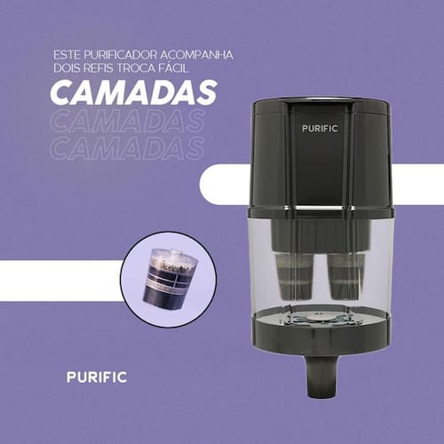 O Purificador de Água Purific 20 para Bebedouro é o primeiro do mundo a substituir o antigo galão. Compatível com uma ampla variedade de bases refrigeradas, proporciona praticidade e economia. Ele acompanha dois refis Camadas Troca Fácil com sete camadas de proteção, realizando purificação completa da água. Cada refil tem capacidade de purificar até 1200 litros. Placa de imãs e infravermelho longo; Regula o pH da água; Reduz cloro; Reduz vírus e bactérias mínimo 99,99% ; Retém partículas; Reduz algas; Reduz fármacos; Reduz metais pesados; Reduz ; Reduz trihalometanos. Metodologia: Standard Methods for the Examination of Water and Wastewater, 2005 Legislação: Portaria Nº 888 de maio de 2022 - Ministério da Saúde Laudos: Emitidos pela UEM Universidade Estadual de Maringá Ficha Técnica: Capacidade: 19 litros total Refil: 2 Camadas Troca Fácil Purificação: 1200 litros 600 por refil Abastecimento: Manual ou rede hidráulica kit não incluso Dimensões sem base: 53 x 27 x 27 cm Dimensões com base: 45 x 27 x 27 cm Embalagem: 60 x 30 x 31 cm Peso: 4,2 kg Livre de BPA e PP-BIP-F Marca: Não Informado