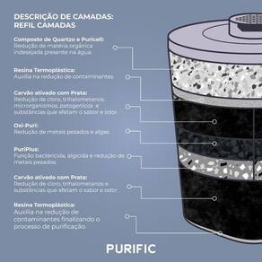 O Purificador de Água Purific 20 para Bebedouro é o primeiro do mundo a substituir o antigo galão. Compatível com uma ampla variedade de bases refrigeradas, proporciona praticidade e economia. Ele acompanha dois refis Camadas Troca Fácil com sete camadas de proteção, realizando purificação completa da água. Cada refil tem capacidade de purificar até 1200 litros. Placa de imãs e infravermelho longo; Regula o pH da água; Reduz cloro; Reduz vírus e bactérias mínimo 99,99% ; Retém partículas; Reduz algas; Reduz fármacos; Reduz metais pesados; Reduz ; Reduz trihalometanos. Metodologia: Standard Methods for the Examination of Water and Wastewater, 2005 Legislação: Portaria Nº 888 de maio de 2022 - Ministério da Saúde Laudos: Emitidos pela UEM Universidade Estadual de Maringá Ficha Técnica: Capacidade: 19 litros total Refil: 2 Camadas Troca Fácil Purificação: 1200 litros 600 por refil Abastecimento: Manual ou rede hidráulica kit não incluso Dimensões sem base: 53 x 27 x 27 cm Dimensões com base: 45 x 27 x 27 cm Embalagem: 60 x 30 x 31 cm Peso: 4,2 kg Livre de BPA e PP-BIP-F Marca: Não Informado Ean: 7898965670405