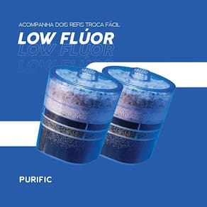 Purificador de água para bebedouro com dois refis Low Flúor Troca Fácil. Elimina flúor, cloro, metais e contaminantes químicos. Ação alcalinizante leve. Capacidade de 19 litros. Purificação de 1200 L.Tipo