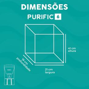 O purificador de água purific 6 é ideal para escritórios e pequenas famílias. Por ser compacto, você pode levar com você nas férias da família, protegendo quem você ama. Não beba água de procedência duvidosa, beba água alcalina de qualidade. Tenha mais conforto e segurança consumindo uma água de qualidade com um purificador 100% fabricado no brasil. Este purificador acompanha um refil do modelo purific camadas, que possui sete camadas de proteção realizando a purificação da água, com as etapas de pré-filtragem, filtragem e o tratamento. Possui capacidade para purificar 600 litros de água, trazendo inúmeros benefícios para sua saúde: Possui placa de imãs e infravermelho longo, que atuam na organização das moléculas da água, facilitando a absorção pelo organismo; Regula o ph da água; Reduz cloro; Reduz de vírus; Reduz bactérias, no mínimo 99,99%; Retém partículas; Reduz algas; Reduz fármacos: exemplos: mínimo 80%, mínimo 67%, metformina mínimo 95%, estradiol mínimo 75%, xenoestrogênio mínimo 78%, entre outros ; Reduz metais pesados: exemplos: cobre mínimo 48%, ferro mínimo 94%, cádmio mínimo 91%, níquel mínimo 98%, Cinza mínimo 71%, sulfato de alumínio mínimo 71%, entre outros ; Reduz : exemplos: atrazina mínimo 75%, diuron mínimo 80%, glifosato mínimo 77%, hexazinona mínimo 81%, 2,4 d mínimo 81% , fipronil mínimo 79%, carbendazin mínimo 81%, entre outros ; Reduz trihalometanos, no mínimo 81%. Legislações: portaria nº 888 de maio de 2022 - ministério da saúde. Metodologia: standard methods for the examination of water and wastewater, 2005. Todos os testes e emissão de laudos foram realizados pela uem universidade estadual de maringá Ficha técnica: Capacidade: 6 litros total, entre água a ser purificada e água já purificada . Refil/elemento filtrante: acompanha 1 um refil/elemento filtrante modelo camadas troca fácil. Capacidade de purificação: 600 litros de água. Abastecimento: manual - para mais informações consulte o manual do produto. Dimensões do aparelho purific 6: 41 cm de altura x 21 cm de largura x 19 cm de profundidade Peso do aparelho: Dimensões da embalagem: 43 cm de altura x 22 cm de largura x 20 cm de profundidade Peso com embalagem: 2 quilos - produto livre de bisfenol bpa e pp-bip-f - metodologia utilizada: cromatografia gasosa acoplada à espectrometria de massas adaptada da nbr 15176:2004.