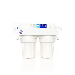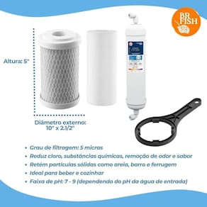 Sistema de purificação de água com 3 estágios de filtragem: polipropileno, carvão ativado block e elemento filtrante alcalino. Reduz cloro, odores, sabores e retém partículas sólidas. Promove água alcalina com benefícios para o equilíbrio do pH, hidratação, ação antioxidante e conforto digestivo. Inclui 2 carcaças brancas, mangueira, conector e chave de abertura.Função retrolavagem