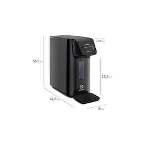 Purificador de água com design elegante na cor preta, oferece água nas temperaturas fria, natural e gelada. Tecnologia de refrigeração por placa eletrônica. Sistema de filtragem com PP e carvão ativado com íons de prata. Retenção de partículas classe C. LED indicativo para troca de refil. Compatível com refis FWEBR02. Bivolt.Lâmpada piloto
