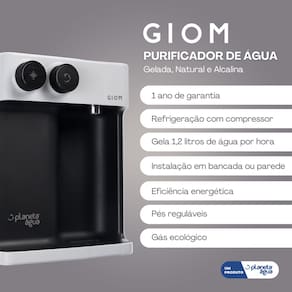 Conteúdo da embalagem: - 1 Purificador Planeta Água Giom Gelado. - 1 Refil Giom Duplo (dentro do purificador). - 1 Kit de auxílio de instalação: conector T, tampão, mangueira, conector em "L", pequena chave e 2 parafusos com bucha. - 1 Manual de instruções.