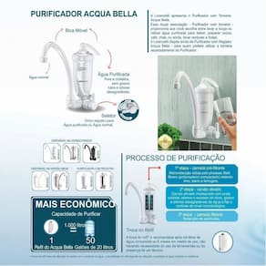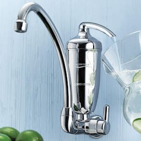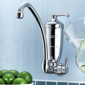 Purificador de água com torneira Lorenzetti cromado para instalação na parede, ideal para beber, preparar alimentos e lavar frutas/verduras.Função retrolavagem