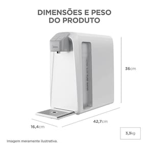 Experimente a pureza e a praticidade em sua casa com o Purificador de Agua SlimPure da Midea. Projetado para oferecer agua fria, natural e gelada, este purificador e uma solucao completa para suas necessidades diarias de hidratacao. Com um design moderno e compacto na cor branca, ele se integra perfeitamente a qualquer ambiente, ocupando pouco espaco com suas dimensoes de 36x16,4x42,7 cm. A instalacao e simples, e sua estrutura leve, com apenas 3,30 kg, facilita o manuseio.